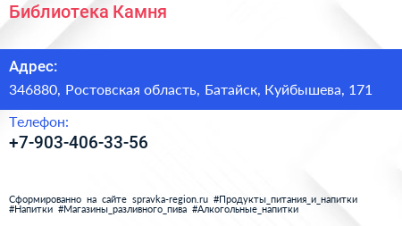 Библиотека Камня по адресу 346880, Ростовская область, Батайск, Куйбышева, 171 в дальнейшем Организация, размещена в следующих категориях: