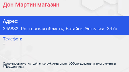 Дон Мартин, магазин по адресу 346882, Ростовская область, Батайск, Энгельса, 347н в дальнейшем Организация, размещена в следующих категориях: