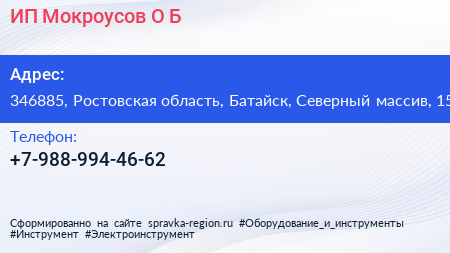 ИП Мокроусов О.Б. по адресу 346885, Ростовская область, Батайск, Северный массив, 15 в дальнейшем Организация, размещена в следующих категориях: