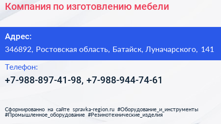 Компания по изготовлению мебели по адресу 346892, Ростовская область, Батайск, Луначарского, 141 в дальнейшем Организация, размещена в следующих категориях: