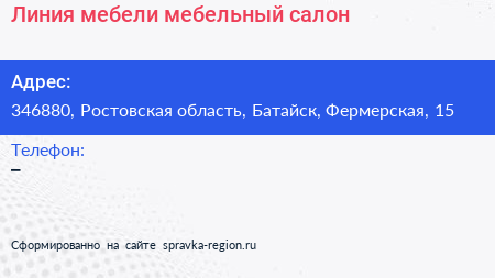 Линия мебели, мебельный салон по адресу 346880, Ростовская область, Батайск, Фермерская, 15 в дальнейшем Организация, размещена в следующих категориях: