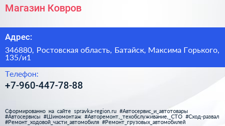 Магазин Ковров по адресу 346880, Ростовская область, Батайск, Максима Горького, 135/и1 в дальнейшем Организация, размещена в следующих категориях: