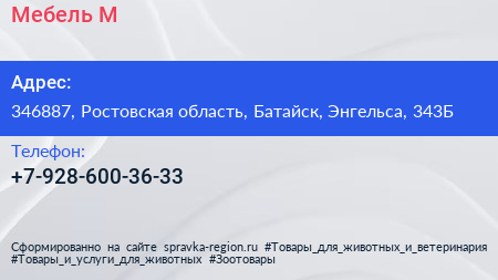 Мебель М по адресу 346887, Ростовская область, Батайск, Энгельса, 343Б в дальнейшем Организация, размещена в следующих категориях: