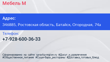 Мебель М по адресу 346885, Ростовская область, Батайск, Огородная, 74а в дальнейшем Организация, размещена в следующих категориях:
