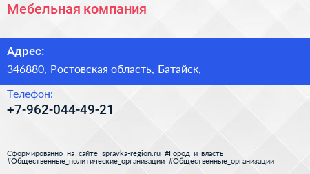 Мебельная компания по адресу 346880, Ростовская область, Батайск, в дальнейшем Организация, размещена в следующих категориях: