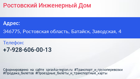 Ростовский Инженерный Дом по адресу 346775, Ростовская область, Батайск, Заводская, 4 в дальнейшем Организация, размещена в следующих категориях:
