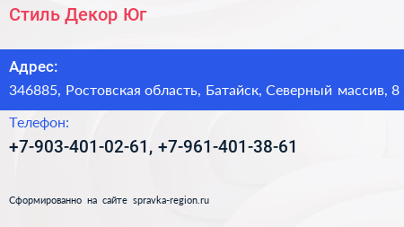 Стиль Декор-Юг по адресу 346885, Ростовская область, Батайск, Северный массив, 8 в дальнейшем Организация, размещена в следующих категориях: