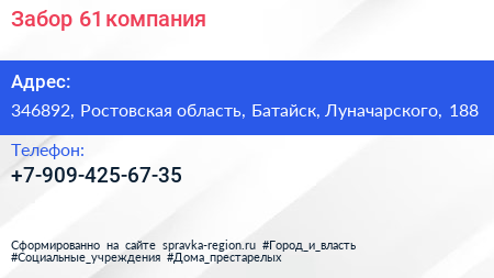 Забор 61, компания по адресу 346892, Ростовская область, Батайск, Луначарского, 188 в дальнейшем Организация, размещена в следующих категориях:
