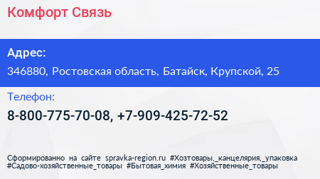 Комфорт-Связь по адресу 346880, Ростовская область, Батайск, Крупской, 25 в дальнейшем Организация, размещена в следующих категориях: