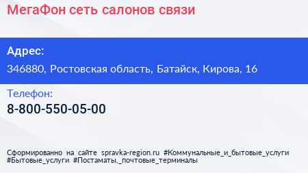 МегаФон, сеть салонов связи по адресу 346880, Ростовская область, Батайск, Кирова, 16 в дальнейшем Организация, размещена в следующих категориях: