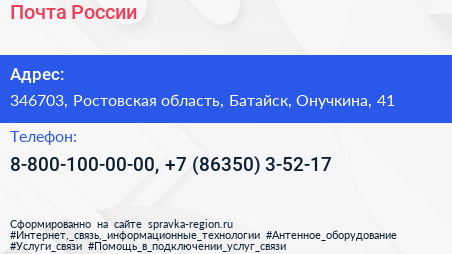 Почта России по адресу 346703, Ростовская область, Батайск, Онучкина, 41 в дальнейшем Организация, размещена в следующих категориях: