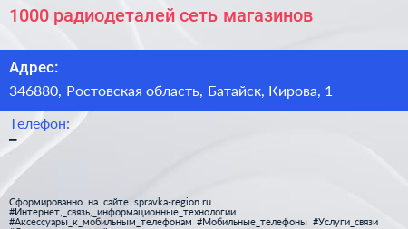 1000-радиодеталей, сеть магазинов по адресу 346880, Ростовская область, Батайск, Кирова, 1 в дальнейшем Организация, размещена в следующих категориях: