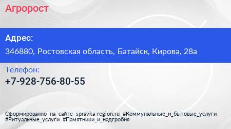 Агророст по адресу 346880, Ростовская область, Батайск, Кирова, 28а в дальнейшем Организация, размещена в следующих категориях: