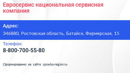 Евросервис, национальная сервисная компания по адресу 346880, Ростовская область, Батайск, Фермерская, 15 в дальнейшем Организация, размещена в следующих категориях: