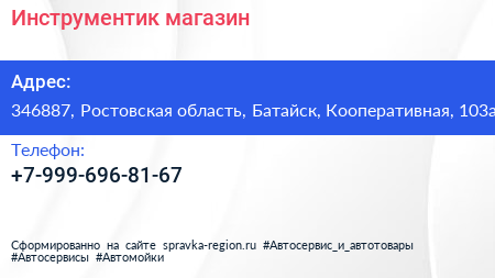 Инструментик, магазин по адресу 346887, Ростовская область, Батайск, Кооперативная, 103а в дальнейшем Организация, размещена в следующих категориях: