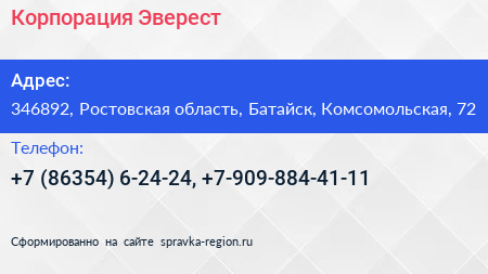 Корпорация Эверест по адресу 346892, Ростовская область, Батайск, Комсомольская, 72 в дальнейшем Организация, размещена в следующих категориях: