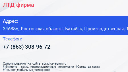 ЛТД, фирма по адресу 346886, Ростовская область, Батайск, Производственная, 1 в дальнейшем Организация, размещена в следующих категориях: