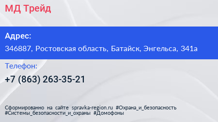 МД-Трейд по адресу 346887, Ростовская область, Батайск, Энгельса, 341а в дальнейшем Организация, размещена в следующих категориях: