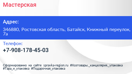 Мастерская по адресу 346880, Ростовская область, Батайск, Книжный переулок, 7а в дальнейшем Организация, размещена в следующих категориях: