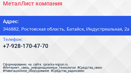 МеталЛист, компания по адресу 346882, Ростовская область, Батайск, Индустриальная, 2а в дальнейшем Организация, размещена в следующих категориях: