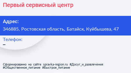 Первый сервисный центр по адресу 346885, Ростовская область, Батайск, Куйбышева, 47 в дальнейшем Организация, размещена в следующих категориях: