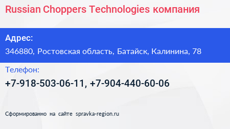 Russian Choppers Technologies, компания по адресу 346880, Ростовская область, Батайск, Калинина, 78 в дальнейшем Организация, размещена в следующих категориях: