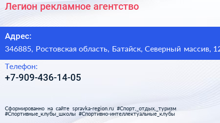 Легион, рекламное агентство по адресу 346885, Ростовская область, Батайск, Северный массив, 12 в дальнейшем Организация, размещена в следующих категориях:
