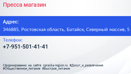 Пресса, магазин по адресу 346885, Ростовская область, Батайск, Северный массив, 5 в дальнейшем Организация, размещена в следующих категориях: