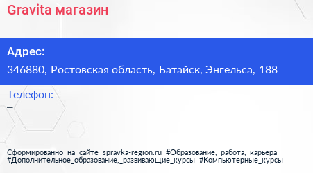Gravita, магазин по адресу 346880, Ростовская область, Батайск, Энгельса, 188 в дальнейшем Организация, размещена в следующих категориях:
