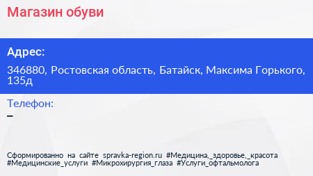 Магазин обуви по адресу 346880, Ростовская область, Батайск, Максима Горького, 135д в дальнейшем Организация, размещена в следующих категориях: