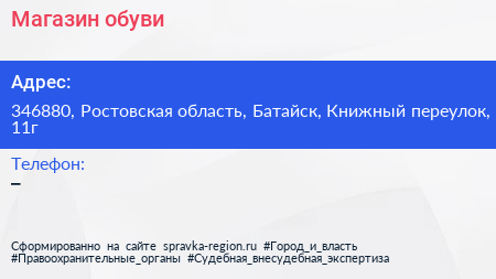 Магазин обуви по адресу 346880, Ростовская область, Батайск, Книжный переулок, 11г в дальнейшем Организация, размещена в следующих категориях: