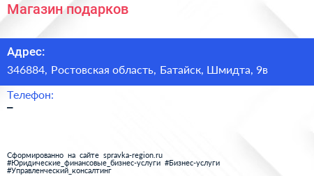 Магазин подарков по адресу 346884, Ростовская область, Батайск, Шмидта, 9в в дальнейшем Организация, размещена в следующих категориях: