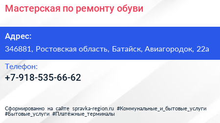 Мастерская по ремонту обуви по адресу 346881, Ростовская область, Батайск, Авиагородок, 22а в дальнейшем Организация, размещена в следующих категориях: