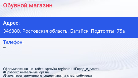 Обувной магазин по адресу 346880, Ростовская область, Батайск, Подтопты, 75а в дальнейшем Организация, размещена в следующих категориях: