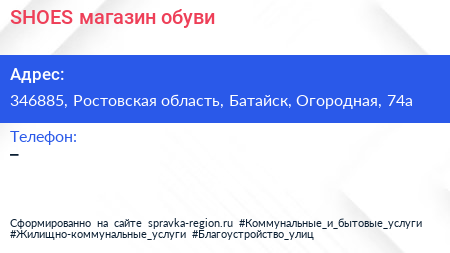 SHOES, магазин обуви по адресу 346885, Ростовская область, Батайск, Огородная, 74а в дальнейшем Организация, размещена в следующих категориях: