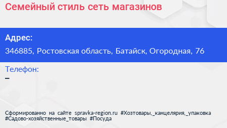 Семейный стиль, сеть магазинов по адресу 346885, Ростовская область, Батайск, Огородная, 76 в дальнейшем Организация, размещена в следующих категориях: