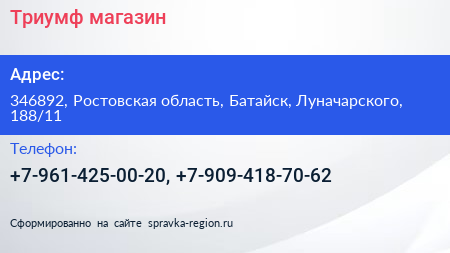 Триумф, магазин по адресу 346892, Ростовская область, Батайск, Луначарского, 188/11 в дальнейшем Организация, размещена в следующих категориях: