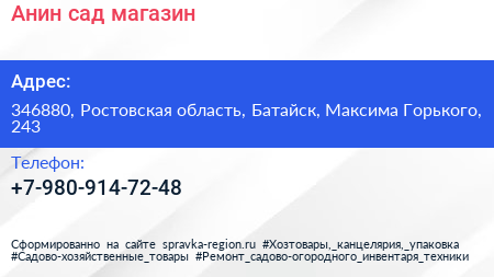 Анин сад, магазин по адресу 346880, Ростовская область, Батайск, Максима Горького, 243 в дальнейшем Организация, размещена в следующих категориях:
