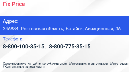 Fix Price по адресу 346884, Ростовская область, Батайск, Авиационная, 36 в дальнейшем Организация, размещена в следующих категориях: