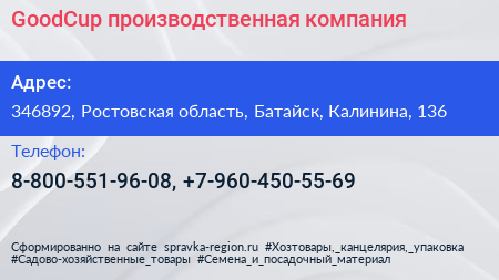 GoodCup, производственная компания по адресу 346892, Ростовская область, Батайск, Калинина, 136 в дальнейшем Организация, размещена в следующих категориях: