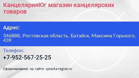 КанцелярияЮг, магазин канцелярских товаров по адресу 346888, Ростовская область, Батайск, Максима Горького, 439 в дальнейшем Организация, размещена в следующих категориях: