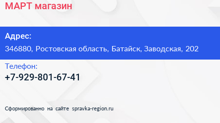 МАРТ, магазин по адресу 346880, Ростовская область, Батайск, Заводская, 202 в дальнейшем Организация, размещена в следующих категориях: