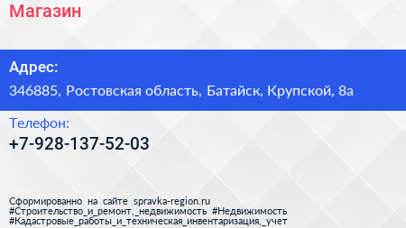 Магазин по адресу 346885, Ростовская область, Батайск, Крупской, 8а в дальнейшем Организация, размещена в следующих категориях: