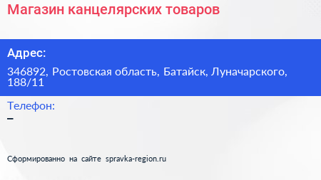 Магазин канцелярских товаров по адресу 346892, Ростовская область, Батайск, Луначарского, 188/11 в дальнейшем Организация, размещена в следующих категориях: