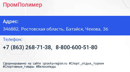 ПромПолимер по адресу 346882, Ростовская область, Батайск, Чехова, 36 в дальнейшем Организация, размещена в следующих категориях: