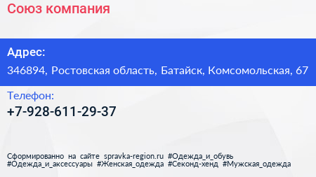 Союз, компания по адресу 346894, Ростовская область, Батайск, Комсомольская, 67 в дальнейшем Организация, размещена в следующих категориях:
