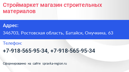 Строймаркет, магазин строительных материалов по адресу 346703, Ростовская область, Батайск, Онучкина, 63 в дальнейшем Организация, размещена в следующих категориях: