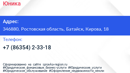 Юника по адресу 346880, Ростовская область, Батайск, Кирова, 18 в дальнейшем Организация, размещена в следующих категориях: