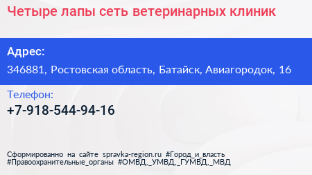 Четыре лапы, сеть ветеринарных клиник по адресу 346881, Ростовская область, Батайск, Авиагородок, 16 в дальнейшем Организация, размещена в следующих категориях: