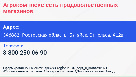 Агрокомплекс, сеть продовольственных магазинов по адресу 346882, Ростовская область, Батайск, Энгельса, 412в в дальнейшем Организация, размещена в следующих категориях: